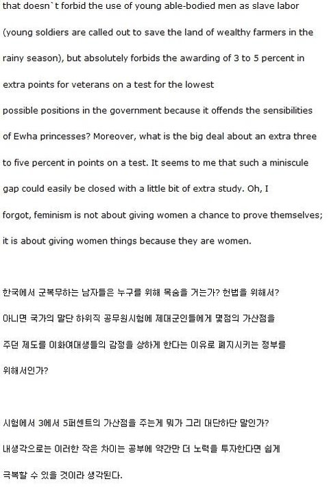 군가산점 폐지에 대하여 분노하는 남성들의 모습에서 경멸을 느낀다는