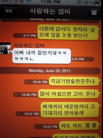 퇴근 하시자 마자 아이팟으로 카톡 날리시는 아버짘ㅋㅋㅋㅋ