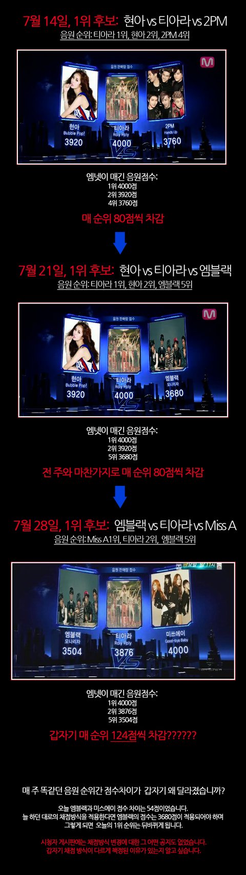 ※ 생방송 중에 집계된 문자 투표를 점수화 하여 합산한다고 하였는데... 방송중 문자 투표 상대평가 점수는 엠블랙 (704) 미쓰에이 (191) 의 점수를 받았다고 볼 수 있습니다..........