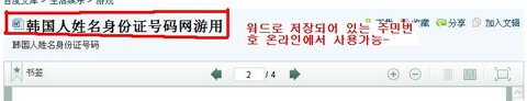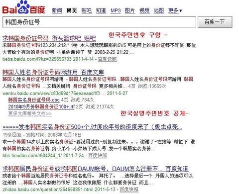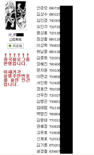 실명은 물론 진짜 주민번호가 확 뜸-_- 중국 장깨들이 이걸 가지고 노는거임