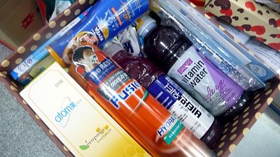 오빠용 상자!! 맨 밑에 비타민(안나왔네요ㅠ_ㅠ)이랑 치약 칫솔 면도 크림!!오빠가 좋아하던 비타민워터랑 책갈피랑 밴드 넣었어요! 음.. 아 비누랑!! 면도기도 넣었어요! 지성님이 선전하시는!! 가지고싶어해서..ㅋㅋㅋㅋㅋㅋ 썬크림도!