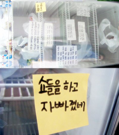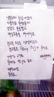 제친구는 냉장고로 가서 종이 한장을 붙이고 떠났습니다.