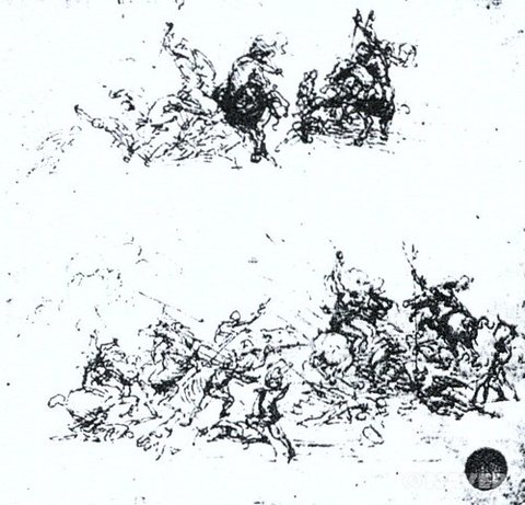 레오나로드 다 빈치는 1503년 피렌체의 의뢰를 받아 베키오 궁전 벽에 이 위대한 걸작을 그리기 시작했다는 설이 있습니다. 현재는 약간의 준비소묘와 모사도만 남아 있습니다. 레오나르도의 ‘마드리드 원고2’에는 1505년 6월 6일 13시에 이 벽화채색을 개시하였다고 기록되어 있으나 현재는 다른 벽화가 그려져 있습니다.