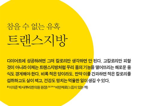 트랜스지방은 불포화지방산인 식물성기름이 상하는 것을 막기 위해 수소를 집어넣는 과정에서 발생하는 지방산으로, 자연 상태에서는 거의 존재하지 않는 기형지방이다. 실제로 트랜스지방이 함유된 라면, 피자, 햄버거, 치킨, 과자, 빵, 튀김 등을 과다하게 섭취하면 동맥경화, 심장병, 뇌졸중, 대장암, 전립선암, 난소암, 유방암, 고지혈증, 당뇨병 등이 올 수 있고, 뇌세포 손상, 만성 피부질환의 원인이 될 수도 있다. 특히 트랜스지방은 현대인들을 살찌우는 주범으로 지목될 만큼 다이어트의 적이다. 지방 함량이 많고 나쁜 콜레스테롤 수치를 빠르게 높이는 데다 전체 칼로리 섭취량을 줄여도 복부비만을 증가시키는 것으로 알려져 있다.