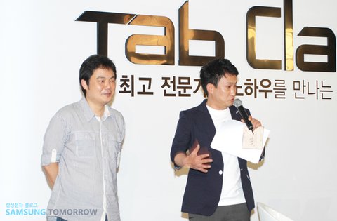 원태연 작가의 Tab Class는 서경석 씨의 사회로 진행되었습니다. 두 분은 드라마 작업을 하다가 친구가 된 사이라고 합니다. 낯을 많이 가린다는 원태연 작가도 친구와 함께여서 그런지 편안하게 Tab Class에 임하는 모습이었습니다. 원태연 작가가 전하는 ‘블로그 글 하나도 남다르게 쓰는 가장 스마트한 방법’ 시작합니다!