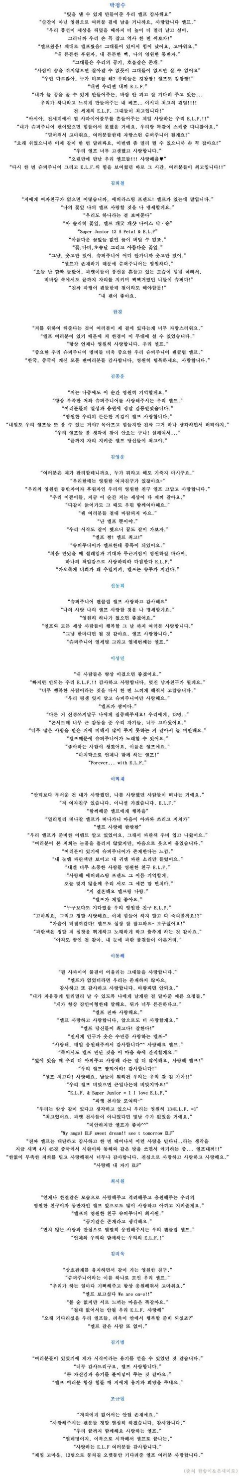 영원이라는 말 믿진 않지만 그대들에겐 꼭 맞는 말. 내 영원한 지원자 엘프. 우리 자주 본다 그치? 사랑하는 사이는 봐도 봐도 질리지 않는다는 말 맞는 것 같아. 이렇게 보고있어도 보고싶은데..내가 말했지? 펄사파이어블루 풍선이 온 세상을 뒤 덮는 그날까지 계속 갈 거라고. 약속했으니까 우리 지금 꼭 잡은 두 손 놓지 말고 함께하자. 슈퍼주니어는 다른 그룹들과 비교를 거부하잖아. 우리 다르잖아~ 누가 비교를 해. 우리는..킹왕짱! 엘프도..킹왕짱! 사랑이 뭔지, 정성이 뭔지, 감동이 뭔지, 눈물이 뭔지 알게 해준 그대들 너무 감사하고 고마워요. 마지막으로 너무 흔하고 흔한 말 같지만, 꼭 하고 싶습니다. 사랑합니다. 이 시대 최고의 그룹. 최고의 리더 이특. -From.박정수-