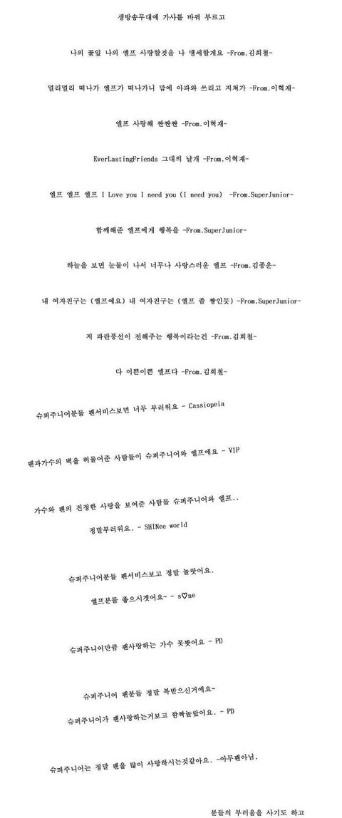 E.L.F.(이엘에프)에게모든 엘프 여러분 안녕하세요. 예성입니다.어..기분좋은 일요일 정말 너무나 소중한 시간 함께 해주신거에대해서 너무너무 감사하게 생각하고 있습니다.이렇게 슈퍼주니어와 함께 해주신거 고마워요.저는 정말 행복한 사람인 것 같아요. 왜 웃는진 잘 모르겠지만,제가 쓴것대로 끝까지 가면 안될것 같단 생각이 들고 하여튼, 저는 정말 축복받은 사람인 것 같습니다.제 마음을 이렇게 작은 종이에 다 담기가 너무 힘들었습니다.항상 여러분들이 감사하다는 말씀 이렇게 자주 드리고 싶어도이런 자리가 잘 안돼서 그러지 못했던 것 같아요.저희 마주않은 이 순간 영원히 기억할께요.여러분들 감사하고 너무 고맙고 사랑합니다. -From.김종운-