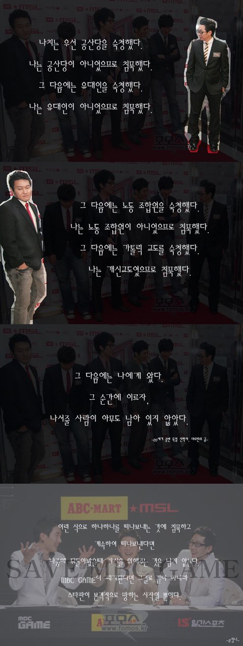게임은 이제 단순한 오락을 넘어, 우리 생활과 가까이 있는 하나의 필수 요소가 되어 버렸습니다. 이러한 가운데 한국의 게임시장을 죽일 수 있는 MBC게임 채널 폐국 방지를 위하여 모두 함께 동참해주셨으면 좋겠습니다. 온게임넷을 즐겨 보시는 시청자 분들도 E-sports의 산업을 위해서 같이 동참해주셨으면 좋겠습니다.