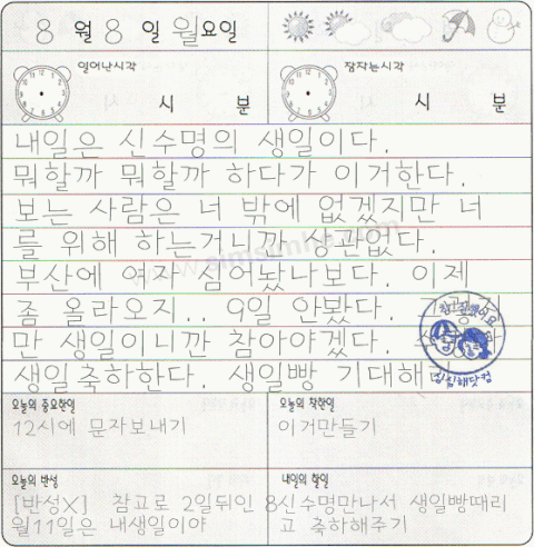 나일기썼어 ... 일기장도 새로삿고 .. 한장쓰고 땡칠꺼야~~~~ 그래 내생일 2일후야~8월 11일~>_<ㅋㅋㅋㅋㅋㅋㅋㅋㅋㅋㅋ