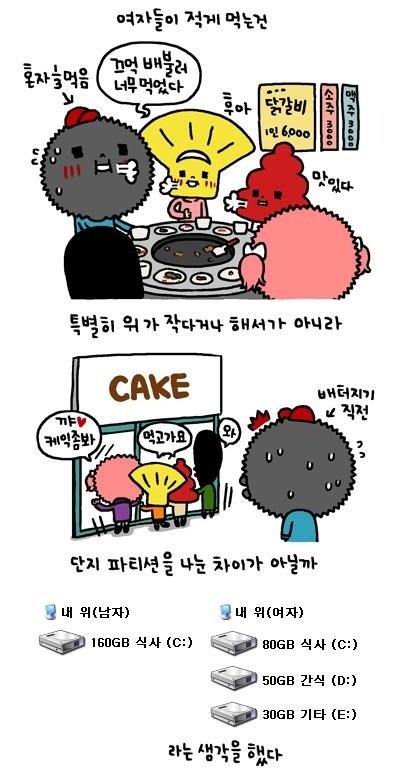 여자들의 뱃속엔 저장공간이 다 따로 있다고 하더군요.. --------------------------------------------------------------------------------------- 베플이 될 줄 꿈에도 몰랐는데ㄷㄷㄷ 다들 공감하시는 듯^^: 소심하게 상콤히 집짓고 갑니다~ㅎ