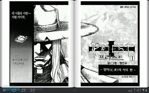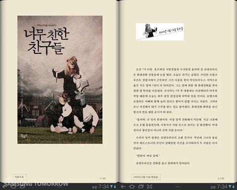 보통 스마트폰에서는 스크린 크기의 한계로 한 페이지씩 분할해서 볼 수 밖에 없는데, 갤럭시탭10.1에서는 실제 만화책처럼 두 페이지로 편하게 열람할 수 있습니다.