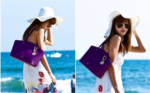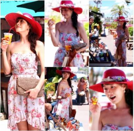 빨간색 모자와 프린트 원피스에서 트로피칼 느낌이 물씬!