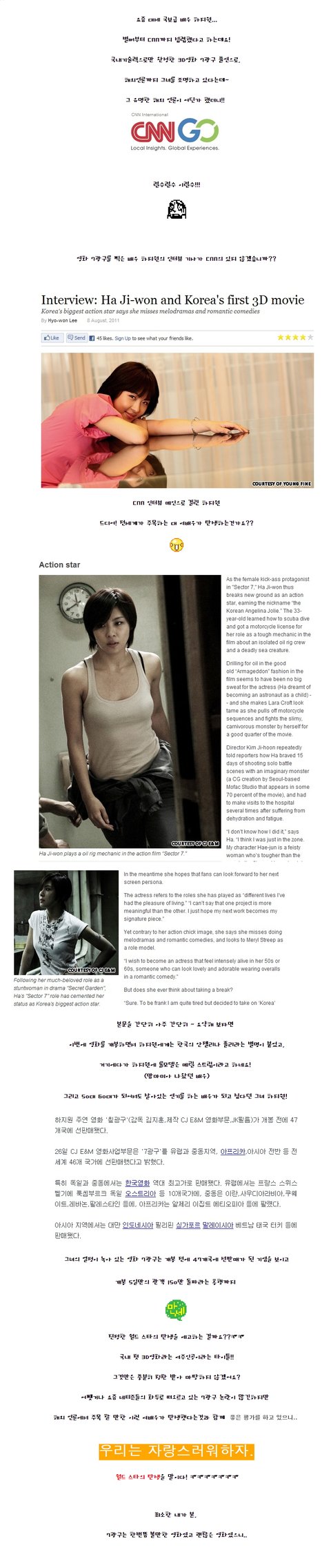 CNN메인페이지의 나타난 배우 하지원!!