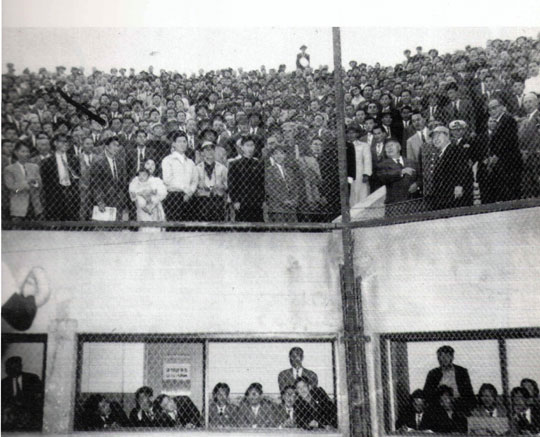 1958년 10월 21일 미 메이저리그팀 세인트루이스 카디널스와 한국 대표팀의 친선경기에 앞서 이승만 대통령이 관중석에서 찢어진 그물망을 통해 시구하는 장면(KBO). 이 시구가 한국 대통령으론 첫 시구였다(사진=KBO)