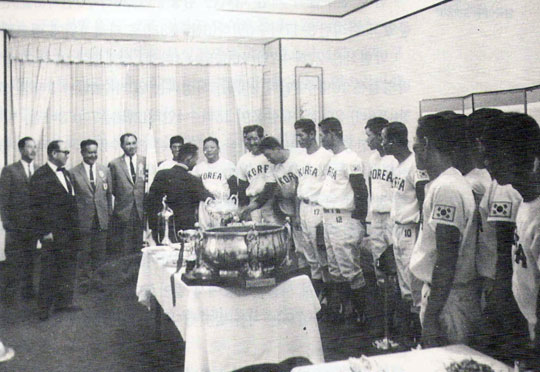 1963년 제4회 아시아선수권대회에서 우승한 한국 대표팀이 장충단 최고회의 의장관실에서 박정희 의장과 악수를 나누고 있다