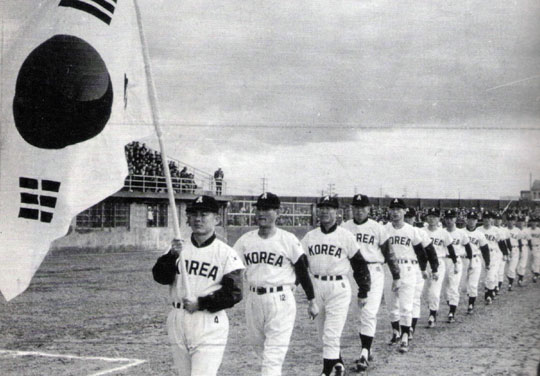 1962년 타이완에서 열린 제3회 아시아선수권대회에 참가한 한국 대표팀이 개막식에서 태극기를 앞장세워 입장하는 장면. 앞에서 4번째가 김응룡이다(사진=KBO)
