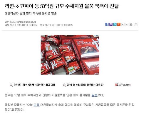 우리 정부가 북한의 수해지역에 초코파이, 라면, 영유아식 등 50억원 상당의 대북 수해지원 품목을 확정하고 북한에 어제 통지문을 발송했다고 하네요.