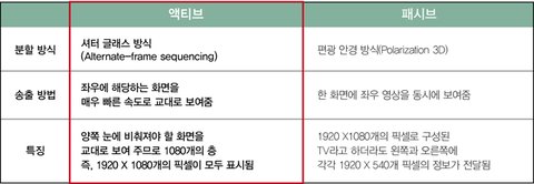 액티브 방식은 양쪽 눈에 비춰져야 할 화면을 교대로 보여주므로 1920*1080개의 픽셀이 한 화면에 모두 표시됩니다. 우리나라에서는 삼성전자가 액티브 방식을 사용한 3D 안경 기술 개발을 진행하고 있습니다.