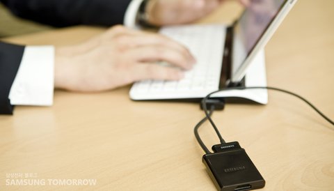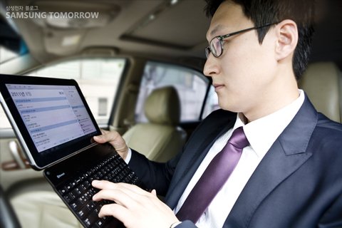 재형 씨가 데스크톱 PC를 사용하는 것처럼 아주 편안한 모습입니다. 아마 삼성전자 갤럭시탭10.1의 키보드 독 때문인 것 같은데요. 갤럭시탭10.1은 가상 키보드로도 문자 입력에 손색이 없지만, 키보드 독을 이용하면, 더욱 더 편리하게 문자를 입력할 수 있습니다. 특히 갤럭시탭10.1로 장시간 문서를 작성할 때, 갤럭시탭10.1이 눕혀있다면 눈의 피로도가 높아지고, 불편함을 느낄 수 있기 때문에 업무 시간에는 필수 아이템이라고 할 수 있겠죠?