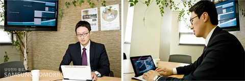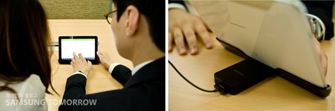 회의를 마치고, 데스크톱 독에 장착되어 있는 갤럭시탭10.1로 제품 분석을 함께 하고 있는 재형 씨와 거래처 직원.