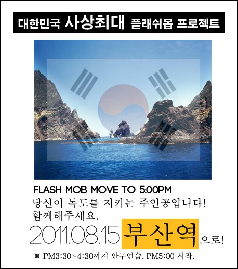 그리고 이번 플래쉬몹의 취지는 '반일 감정을 내세운 독도는 우리땅' 이라기 보다는 우리나라의