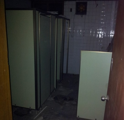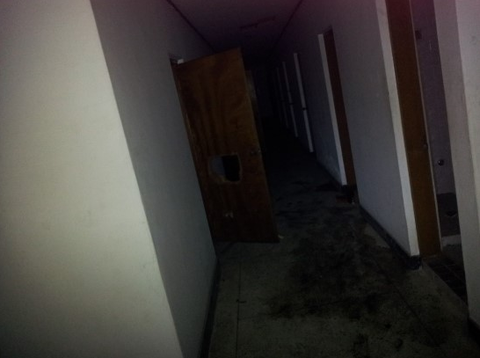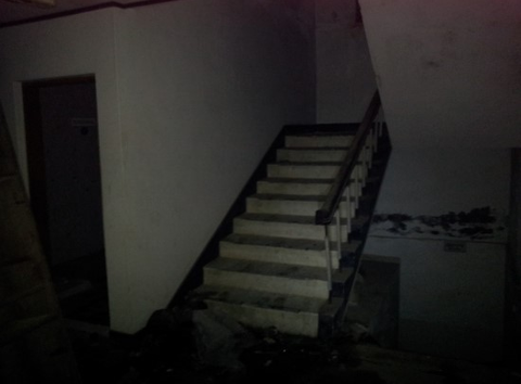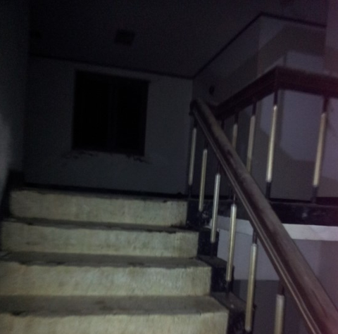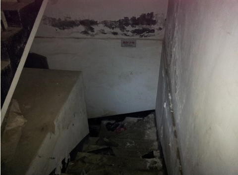 복도로 들어서면 첫번째에 세면장이 있고 그옆에 화장실이 있습니다. 이층도 이렇게 시작합니다. 천장에 형광등이 있던 자리는 모두 뜯겨저나가서 구멍이 뚤려있습니다. 사진에는 보이지 않지만 동영상에서는 천장이 많이 나와요 ㅋㅋㅋㅋㅋㅋㅋ 저희가 동영상을 찍었는데 2층으로 올라가면서 필자가 한마디 합니다. 어?! "1층이랑 냄새가 다르네"??...