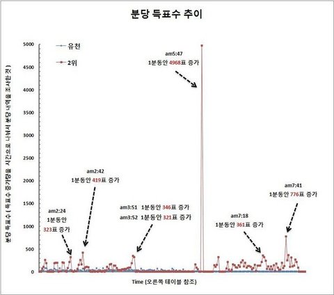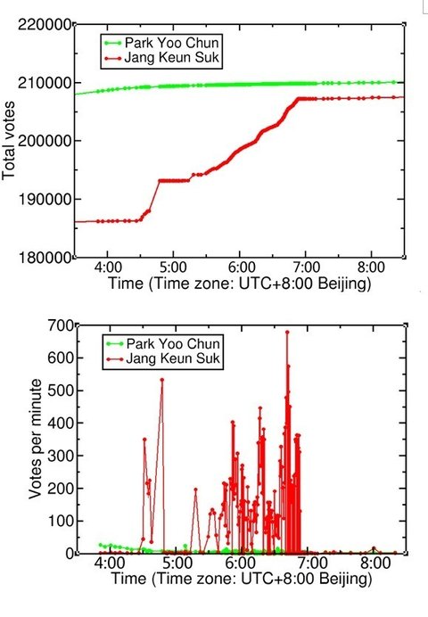 또한 장근석씨의 표가 갑자기 2분만에 5000표가 늘어나고 10시간만에 2만여표로