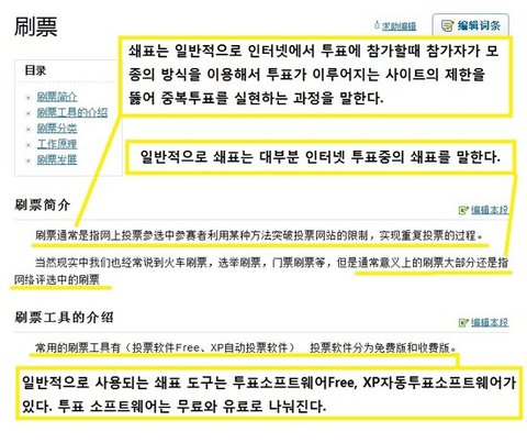 coo-kie限制(쿠키제한),SESSION限制(SESSION제한),IP限制(제한),资料(比如身份证限制)자료 예를들어 주민등록증 제한,手机限制(短信投票)휴대폰인증제한,验证码限制인증코드제한 등 투표싸이트 제한을 돌파해서 중복투표하는 과정을 말함. 투표싸이트 제한이라고 했지 쿠키제한이라고 하지 않았죠 장어님들??? 제멋대로 注释를달고 그러네요 이것도 엄연히 조작입니다..
