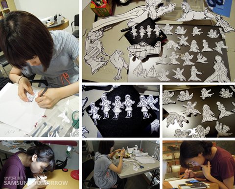 어린 왕자를 포함해 갤럭시탭10.1을 배경으로 등장하는 여러 인물들이 있습니다. 작은 표정이나 손짓, 걸음 동작까지 세세하게 표현하기 위해 섬세하게 한땀 한땀 그리고 오렸습니다.