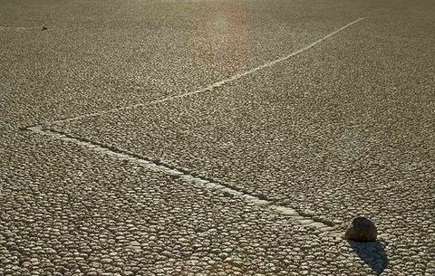 평평한 사막 위에서 바위가 스스로 움직임