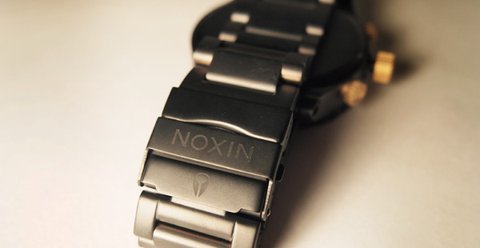 시계줄의 버튼 부분에는 닉슨시계 브랜드 로고와 텍스트가 적혀있습니다.