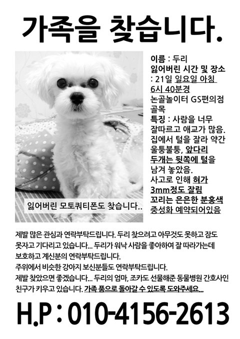 무조건 안기는 버릇이 있어서 분명 다른분이 보호중일꺼 같은데 제발 연락부탁드립니다....