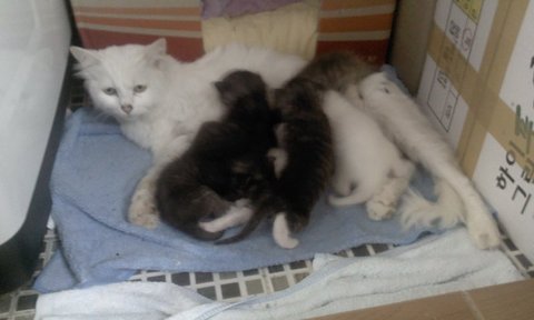구조한지 3일후(6/19)에 구조한 고양이가 여섯마리의 아기 고양이들을 출산하게 되었습니다.