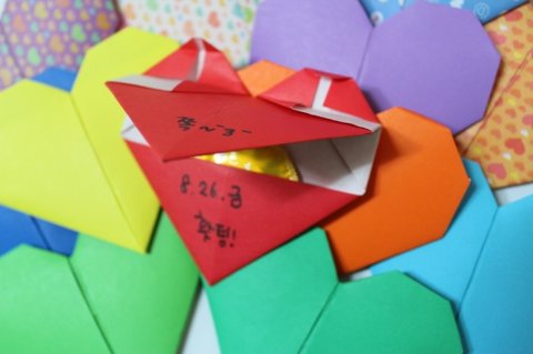 신의 손놀림으로 하트를 접기 시작함