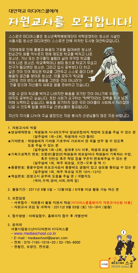 > 미디어 스터디에 관심 있는 여러분이라면 자원봉사도 하고, 수업도 들어 볼 수 있는 일석이조의 기회가 될 것 같습니다~!!