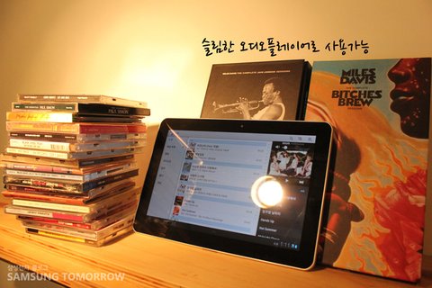 카메라 기능뿐만 아니라 듀얼 스피커로 즐길 수 있는 오디오 기능도 매력적인 요소 중에 하나인데요. 제가 평소에 좋아하는 노래들을 갤럭시탭10.1에 넣어 놓으면, 언제 어디서든 노래를 즐길 수 있습니다. 자신이 넣어놓은 노래 목록이나 재생시 보이는 앨범 정보는 음악을 즐기는 동안에 시각적인 만족도도 높여 주는 것 같습니다.