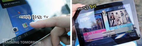 구글 지도로 찾아서 청계천에 도착하자마자 저는 친구와 발을 담그고 앉았는데요. 앉아서 이야기를 나누다가 뮤직뱅크하는 시간이 되었다는 친구의 말에 잠시 DMB를 켜고 TV를 봤습니다. 갤럭시탭10.1의 DMB 기능은 어디서든 TV를 볼 수 있다는 것이 장점인데요. 스마트폰의 DMB와는 차원이 다른 미니 TV같은 큰 화면이 그 매력을 더해준답니다.