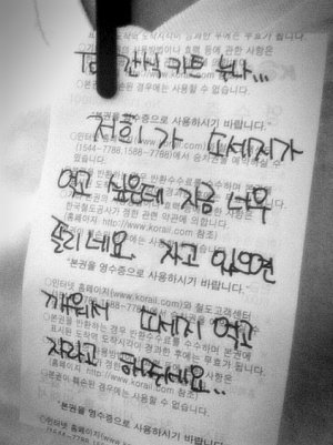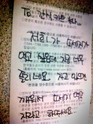 KTX 영수증 뒷 면에 자느라 소시지를 놓치게 될 까봐 간식카트누나한테 편지를 쓰고 있었던거임!!ㅋㅋ