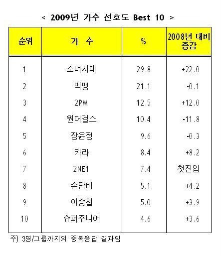 2009년 하반기 남자부분 1위 빅뱅(23.5%) 2위 2PM (21.7%) 3위 비 (16.9%)