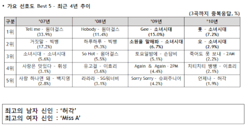 2010년 상반기 남자부분 1위 2PM(19.8%) 2위 2AM(15.1%) 3위 이승기(13.0%)
