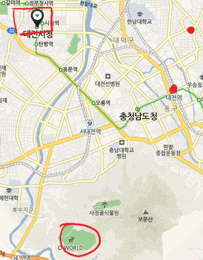 빨간색으로 칠한 곳들이 대전에서 돌아 다닌 곳임
