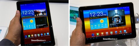 정확하게 1년 전이었다. 갤럭시탭 7인치를 만났던 때가. 그 때 만져 본 삼성의 첫 번째 안드로이드 태블릿인 갤럭시탭 7인치는 안드로이드를 채택했음에도 더 높은 해상도와 빠른 반응(국내 출시품과 약간 차이가 있었음)에 들고 다녀도 부담 없는 크기라는 점이 인상적이었다. 비록 태블릿 전용 운영체제를 쓴 제품이 아니라는 구글의 디스 발언으로 논란이 있기는 했지만, 7인치 태블릿 시장에 대한 첫 번째 도전이라는 의미까지 깎아내릴 수는 없었다. 그리고 1년 뒤 삼성이 다시금 7인치대 갤럭시탭을 IFA 식전 행사인 언팩을 통해서 공개했다. 크기는 약간 더 커졌고, 해상도는 높아졌고, 운영체제의 논란도 더 이상 없는 태블릿이다. 베를린에서 만져 본 그 제품, 갤럭시탭7.7은 이렇다.