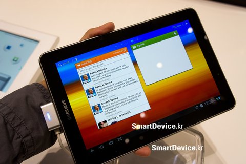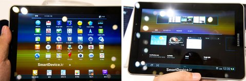 갤럭시탭7.7도 터치 위즈 UI를 적용한 터라 기본적인 사용성은 갤럭시탭10.1과 비슷하다. 하지만 앞서 1GHz 듀얼코어 AP인 테그라2를 적용했던 갤럭시탭10.1과 다르게 7.7은 다른 1.4GHz 듀얼코어 AP를 쓰고 있어 이보다는 좀더 나은 움직임을 보여줄 거라는 믿음이 더 커진 것이 사실이다(정확한 AP의 제원은 차후에 기재). 이번 IFA에 전시된 갤럭시탭7.7이 모두 최종 모델이 아니라 개발 중인 샘플이라는 점을 감안하고 다뤄보니 일단 기본적인 UI의 움직임은 갤럭시탭10.1보다 약간 더 나은 느낌이긴 하다. 그렇다고 종전 10.1형 허니콤 태블릿보다 월등히 더 좋아졌다고 말하기는 어렵다. 여러 위젯을 띄운 상태에서 홈 UI의 움직임은 나아진 것이 맞지만, 그렇다고 종전보다 월등히 좋아졌다고 말할 수 없는 부분이 있다. 이 부분은 앞으로 제품이 출시될 때까지 얼마나 최적화를 잘 하느냐에 달린 문제로 남겨질 것 같다.