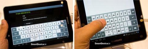 무엇보다 갤럭시탭 7.7을 손에 들었을 때 무엇보다 마음에 든 것은 역시 작은 7인치 태블릿의 무게와 얇은 두께였다. 그 가벼움과 얇은 두께 덕분에 들고 쓰는 데 한결 부담이 적었는데, 무엇보다 세로로 세운 상태에서 엄지로 키보드를 두드릴 때의 자판 간격이 너무 좋다. 하지만 가로 방향 입력은 아직 버겁다.