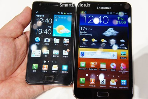 실제로 갤럭시 노트를 손에 쥐어보면 어떨까. 위 사진은 갤럭시S2와 비교해 본 사진인데, 그래도 딴 데 가서 크기로 기죽지 않는 4.3인치의 갤럭시S2가 '작아'보인다. 대신 필요없는 베젤 주변부를 최소화한 탓에 그렇게까지 커지진 않았지만 여전히 큰 건 사실이다. 손이 작은 이들이 갤럭시 노트를 한손으로 자유롭게 다루기는 힘들 듯 하다.