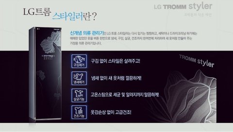 LG의 트롬스타일러는 의류관리기로 조금 생소한 제품인데요, 옷을 걸어만 둬도 살균 구김제거 냄새제거 스팀기능 까지 가능 하다고 합니다. 이 제품은 속도도 속도지만 간편함이 가장 주된 장점이라고 할 수 있겠는데요, 옷을 몇 개를 걸어도 39분이면 냄새 제거가 되고 41분이면 셔츠의 구김 제거가 된다고 합니다. 여기에 스팀, 살균도 2시간 이내면 오케이! 우리가 할 일은 옷을 걸고 문을 닫고 버튼을 누른 후 자거나 놀고, 아침에 일어나거나 다시 와서 문을 열고 옷을 가져가는 일 뿐 입니다. 회식하고 돌아와 걸어두고 자면 다음날 냄새제거는 물론이고 다림질까지 된 옷을 입을 수 있다니 환상적입니다! 가격은 다소 비싼 인터넷 최저가 기준 158만8900원 입니다.