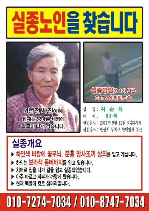 인상착의를 잘 기억해두셨다가 비슷한분을 만나면 꼭 신고해주시기를 간곡히 부탁드립니다. 오늘 전단지를 계속 돌렸는데 엄마아빠께 연락이오지 않는다고 하네요. 지나가다가 노인분이 혼자계시면 관심있게 봐주시고 연락 꼭 주시길 부탁드릴게요.