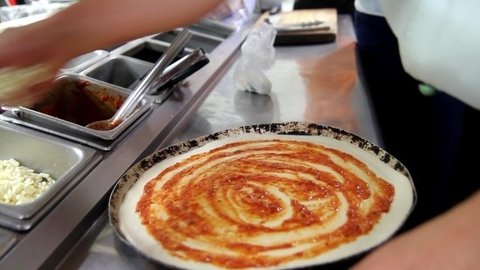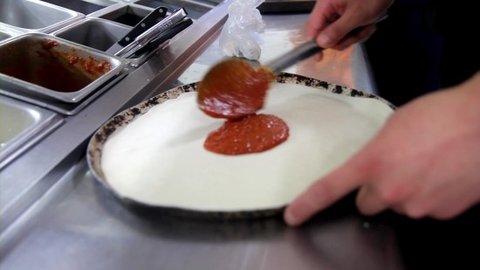 1. 피자도우를 팬에 놓고 소스를 잘 펴 주세요