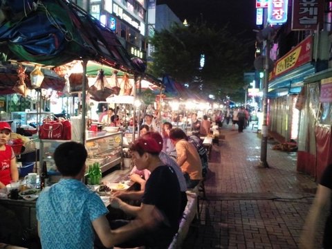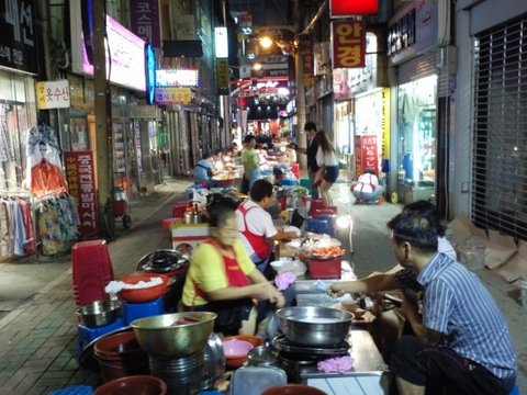 쭈구리고 앉아서 먹는 떡볶이와 분식들