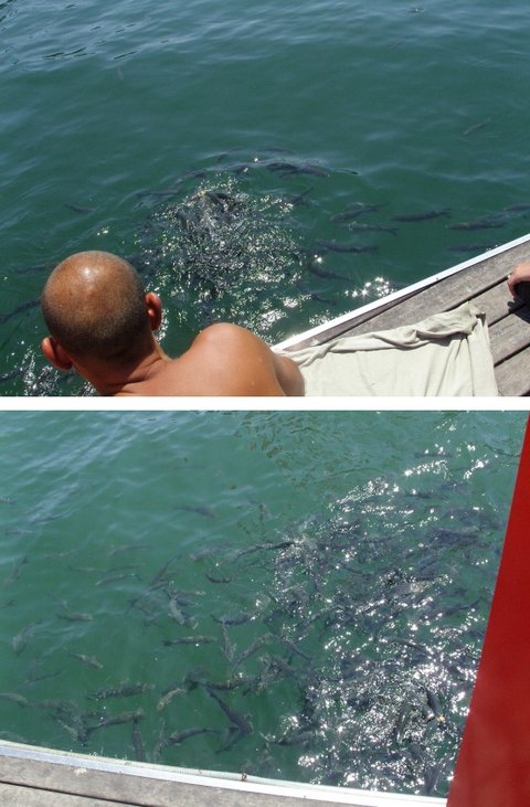 상체 누드셨던 아저씨께서 바다에 빵조각을 던졌더니 막 물고기때들이 몰려들었음
